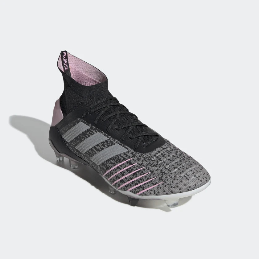 De nieuwe adidas Predator voetbalschoenen voor vrouwen zijn een combinatie van zwart/zilver en roze. De upper van deze Predator voetbalschoenen is zwart en bevat een zilveren all-over spickle print. De neus van de schoenen is bijna geheel zilver en naar de achterkant van de schoenen vervaagt dit. De enkelsok van de nieuwe Predators voor vrouwen is zwart en de hielkap van deze kicksen is weer roze. Dit geldt ook voor de diagonale strepen op de voorkant van de schoenen. De zijkanten van de nieuwe Predator bevatten drie zilveren adidas trademark strepen en de zoolplaat van de schoenen is een flitsende combinatie van roze/zwart en zilver. We gaven het net al aan. Qua technologie zijn de voetbalschoenen hetzelfde als de Predator voetbalschoenen uit het Exhibit pack. Van deze schoenen is alleen een 19.1 versie uitgebracht. Dit is de versie waarop de veters wel zichtbaar zijn. Lees hieronder verder voor meer technologieën voor de zwart/roze adidas Predator voetbalschoenen voor vrouwen!