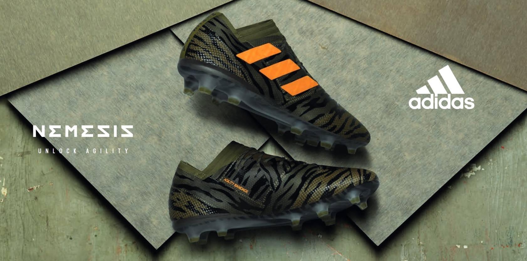 De opvolger van de Nemeziz uit het Skystalker pack zijn is niet makkelijk. Maar adidas weet de wereld weer te verassen met het nieuwe ontwerp van de Nemeziz in het Lone Hunter Pack. De kleurencombi wordt door adidas beschreven als Trace Olive, Bright Orange en Core Black. Voor het blote oog zijn dit de kleuren olijfgroen, oranje en zwart. De bovenkant van de schoen bevat de klassieke Nemeziz sok die de vorm van een V heeft. Deze sok heeft een olijfgroene kleur. De drie bekende adidas strepen van het Duitse sportmerk staan op de buitenkant in een feloranje kleur net als de tekst ‘360 AGILITY BANDAGE’ aan de binnekant van de schoen. Deze zelfde kleur is te zien op de gehele onderkant en het noppenwerk van de schoen. Verder bevat de voet van de schoen een camouflage in de kleuren olijfgroen en zwart. Net als bij de andere 2 soorten voetbalschoenen uit het Lone Hunter Pack van adidas (de X en de Predator) is de camo print gebaseerd op roofdieren uit de natuur.