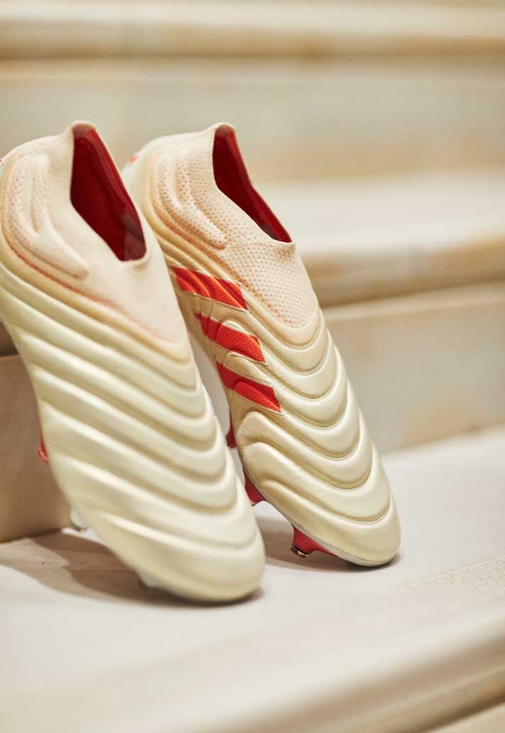 De eerste colourway van de adidas COPA 19+ voetbalschoenen is onderdeel van het adidas Initiator pack. Dit pack bevat ook nog nieuwe X, Nemeziz en Predator voetbalschoenen. Deze worden echter op een later moment uitgebracht. De nieuwe generatie COPA voetbalschoenen bevatten helemaal geen veters meer en zijn uitgerust met een enkelsok. Over de functies daarvan vertellen we straks meer. De nieuwe schoenen uit het Initator pack zijn beige/champagne gekleurd en bevatten bovendien fel rode accenten. Deze fel rode accenten komen terug in de drie adidas stripes aan de zijkanten van de voetbalschoenen, de binnenkant van de voetbalschoenen en de onderkant van de schoenen. De achterkant van de update van de Copa bevat de naam van de schoenen. De eerste colourway van deze nieuwe voetbalschoenen is niet alleen een opvallende, de schoen heeft namelijk qua materialen en technologieën ook een grote metamorfose ondergaan. Check hieronder welke!