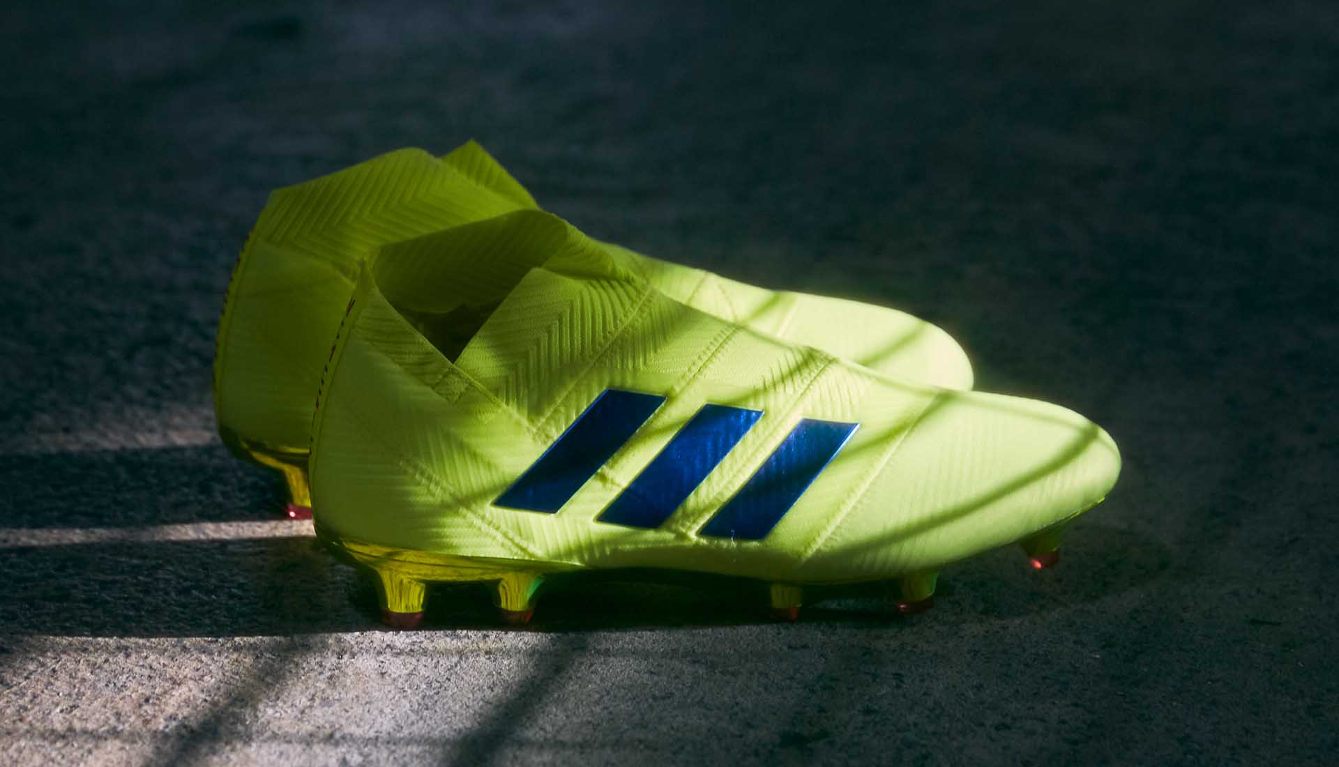 De nieuwe adidas Nemeziz voetbalschoenen uit het Exhibit pack zijn eigenlijk niet te missen in het stadion en op het veld. Vrijwel alles aan deze voetbalschoenen is namelijk fel geel. Een uitzondering hierop vormen de drie strepen van adidas aan de zijkanten van de voetbalschoenen. Deze zijn namelijk blauw. Het Nemeziz wordmerk en het adi logo op de hiel van de nieuwe schoenen is rood en ook de noppen van de nieuwe Nemeziz bevatten rode accenten. Messi gaat deze voetbalschoenen overigens niet dragen. Die heeft zijn eigen signature versie en het lijkt erop dat het nieuwe pack geen nieuwe voetbalschoenen van Messi herbergt. Het is take it or leave it met deze voetbalschoenen. Ben je geen fan van deze kleurstelling, misschien kunnen dan de technologieën van de nieuwe adidas Nemeziz voetbalschoenen je overtuigen! Hierin is in vergelijking met de vorige versie niets veranderd. Toch bespreken we ze opnieuw!