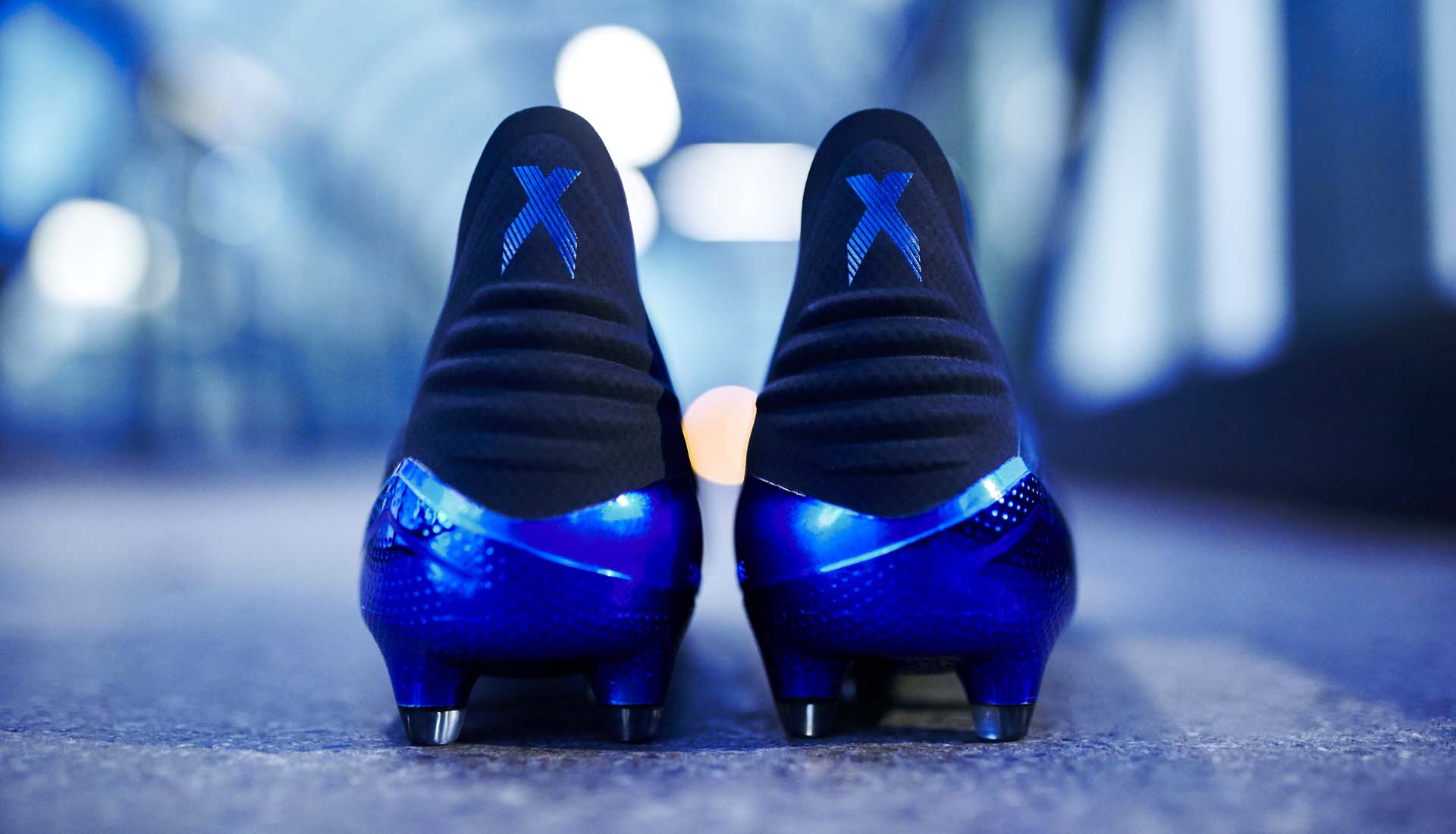 De nieuwe adidas X voetbalschoenen zijn overwegend zwart en bevatten bovendien donker blauwe (metallic blue) accenten. Deze blauwe details zijn te vinden in de hielkap, in subtiele details over de upper en in de noppen. Zowel letterlijk als figuurlijk zijn de nieuwste adidas X kicksen schitterend. De schoenen hebben namelijk een glanzend effect en het lijkt er op alsof de schoenen gedipt zijn in olie, waardoor ze ook nog eens echte snelheid uitstralen. Laat dat nu net ook het doel zijn waarvoor adidas deze zwarte voetbalschoenen heeft uitgebracht. Daar dragen alle technologieën en materialen van de schoen natuurlijk ook aan bij en die bespreken we in het vervolg van het blog. De drie strepen van adidas staan overigens weer traditioneel op de voorvoet van de voetbalschoenen en de achterkant van de schoenen bevat het X trademark teken van het Duitse sportmerk in de iconische tint blauw!