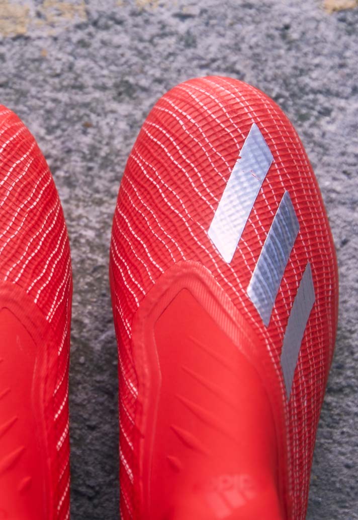 De upper van de fel rode adidas X18+ voetbalschoenen is ook dit keer weer gemaakt van een super zacht materiaal. Dit materiaal wordt door adidas Speedmash genoemd en voelt aan als een tweede huid. Kenmerkend aan dit materiaal is dat het zich perfect vormt naar de vorm van de voeten. De zogenaamde Skeletal Weave bestaat uit een woven materiaal van garens en dit zorgt voor een ideale eerste touch en een perfect balgevoel. De adidas X 18+ voetbalschoenen bevatten geen veters (de 18.1 versie overigens natuurlijk wel). Hierdoor heb je een nog schoner baloppervlak en kan je dus nog preciezer en meer gefocust schieten. De adidas X 18+ voetbalschoenen bevatten een rode enkelsok. Deze heeft een zogenaamde v-vorm en wordt om die reden ook wel de ''Claw collar'' genoemd. Zoals bij alles van de adidas X 18+ voetbalschoenen staat deze enkelsok geheel in het teken van snelheid. De claw collar zorgt voor een ultieme pasvorm, waardoor je hoge snelheden kunt behalen. Bovendien zorgt de sok voor een juiste stabiliteit, die je nodig hebt als je op snelheid bent! Een ander kenmerk van de X voetbalschoenen is de externe hielkap, die adidas heeft toegevoegd aan de voetbalschoenen. De hielkap, welke aan de achterkant is uitgerust met een speciaal design van ribbels, zorgt voor het zogenaamde lockdown effect. Hierdoor ga je niet in je schoenen schuiven en het zorgt voor stabiliteit, wanneer je je snel van je tegenstander lost wilt maken. Ter hoogte van de achillespees bevindt zich een speciaal geweven materiaal en dit biedt je weer de ultieme bewegingsvrijheid.