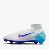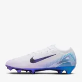 De Nike Mercurial Superfly 10 en Vapor 16 voetbalschoenen uit het Chromatic pack zijn wit en bevatten zowel paarse als lichtblauwe accenten. De swoosh op de zijkanten is paars met een gradi”ent effect en de diagonale strepen ter hoogte van de hiel zijn lichtblauw. De kleuren paars en lichtblauw komen ook terug in de zoolplaat van de schoenen en de interne inlegzool van de Mercurials uit het Chromatic pack is ook lichtblauw. Uiteraard zijn de Mercurial Superfly en Vapor voetbalschoenen weer voorzien van de nieuwste technologieën. De upper van de voetbalschoenen bestaat uit Gripknit, Flyknit en Atomknit. Het Gripknit is een klevend materiaal, wat zorgt voor het perfecte balgevoel. Door dit materiaal heb je de ideale controle bij het passen, schieten en dribbelen. Het Flyknit materiaal is super dun en zorgt voor ervoor dat je voeten nog dichter bij de bal zijn. Het Atomknit materiaal bevindt zich vooral aan de zijkanten en biedt de perfecte ondersteuning wanneer je op snelheid bent. De zoolplaat heeft weer het golfachtige grippatroon met trapsgewijze noppen. Sinds een jaar bevatten de Mercurials dit patroon aan de onderkant. Dit heeft als doel de grip te verbeteren bij het maken van creatieve of onverwachte acties wanneer je op snelheid bent. De Mercurials bevatten ook weer een Air Zoom unit, die ook zorgen voor een perfecte demping en ondersteuning!
