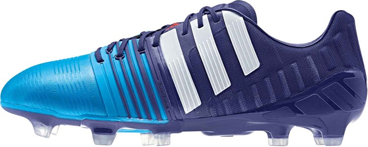 Daarnaast zijn de nieuwe Nitrocharge schoenen voorzien van beschermende pads aan de achterkant van de hiel en rondom de tenen, welke als doel heeft bescherming te bieden tegen mogelijke tackels van tegenstanders. De voorkant van de Nitrocharge is gemaakt van een synthetisch materiaal (Hyrbidtouch), welke het gevoel van leer combineert en ook waterafstotend werkt. Dit zorgt voor een betere balcontrole. Allerlaatst zijn de nieuwe Nitrocharge schoenen voorzien van het Energypulse systeem van Adidas. Door het Energypulse systeem beweegt de loopzool mee met de tenen, wat de explosiviteit van spelers bevordert. De onderkant van de nieuwe schoenen bevat het TraXion 2.0 systeem, waarbij de noppen op een manier zijn geplaatst dat het maximale grip geeft op het voetbalveld. De Adidas Nitrocharge voetbalschoenen zijn zowel in de 1.0 als in de 2.0, 3.0 als 4.0 versie gelanceerd. Deze versies staan voor de verschillende prijsklassen van de Nitrocharge en zijn zowel in kindermaten als in volwassen maten te koop. Voor € 40,- kan je deze al in kindermaten verkrijgen. De duurste Nitrocharge voetbalschoenen zijn € 210,-! Check hieronder de foto's van de licht blauw/paarse Nitrocharge voetbalschoenen. Deze paarse Adidas schoenen kan je vanaf nu kopen in de online voetbalschoenenshop van Adidas.
