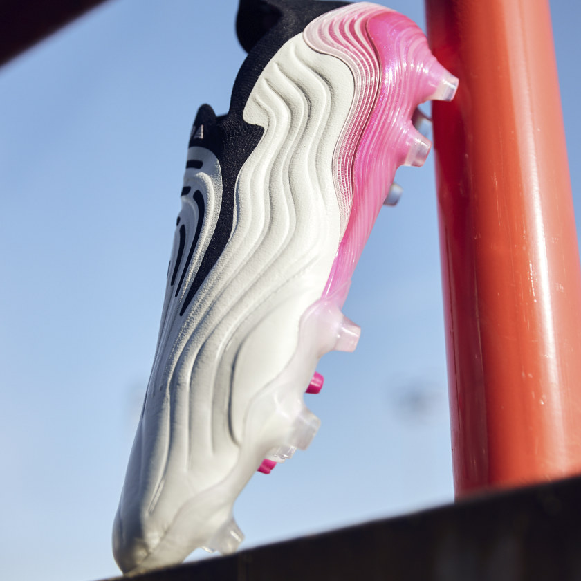 De adidas COPA voetbalschoenen worden zoals altijd gekenmerkt door het wat aparte golvende design van de upper van de schoenen. De upper van de adidas COPA Sense voetbalschoenen is dus overwegend wit, met uitzondering van het gedeelte rondom de sok en de instap van de schoenen. Deze is namelijk zwart. Toch zijn de schoenen niet voor niets onderdeel van het ''Superspectral'' pack, in de schoenen zijn namelijk ook super spectrale kleuren verwerkt. Ter hoogte van de achterkant en de zoolplaat van de schoenen bevatten de nieuwe Copa's roze golven. Ook een deel van de zoolplaat van de schoenen is ''Shock pink.'' Het Copa trademark logo staat ter hoogte van de instap van de schoenen en het performance logo van adidas prijkt op de hiel van deze gloednieuwe voetbalschoenen. Ook deze adidas Copa Sense voetbalschoenen zijn weer zowel met veters (de .1 versie) als zonder veters (de + versie) uitgebracht. Sinds februari 2021 bevat de COPA Sense silo een combinatie van SensePods, TouchPods en de SoftStud technologie. Ben je daar nog niet bekend mee? Lees dan vooral verder!
